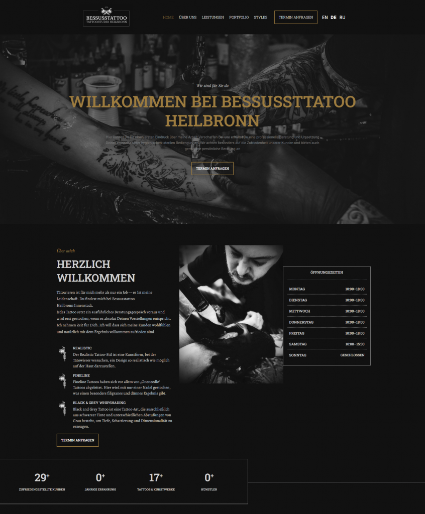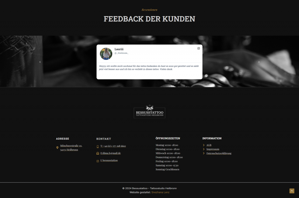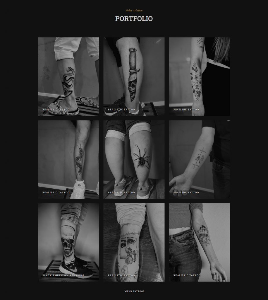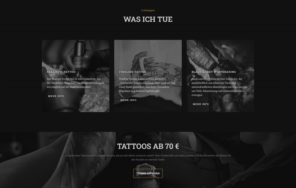 The client requested a modern, dark-themed website inspired by "My Story Tattoo Karlsruhe." The goal was to create a bold, atmospheric online presence that reflects the identity of the studio, along with a fully functional appointment booking system.
