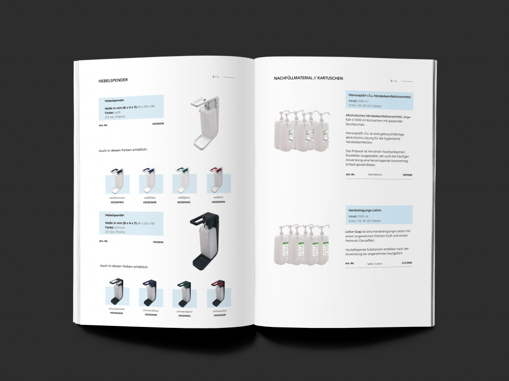 The development of a clearly structured and user-friendly product brochure for the arm lever dispenser HS1200. Key requirements included showcasing the different color variations, integrating an easy-to-understand user manual with illustrations, and creating a modern, professional layout suitable for sales and customer communication.