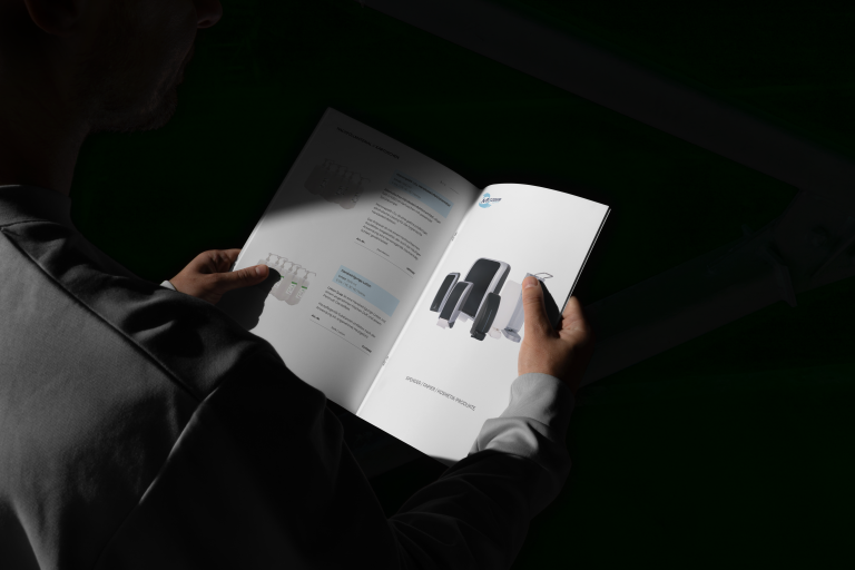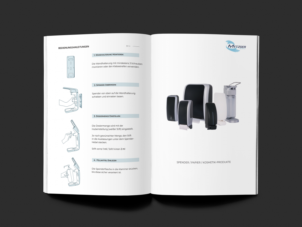 I designed a 6-page DIN A4 brochure with a clean structure and clear visual language. I created, retouched, and optimized all product photos for print. The user manual was supported with illustrations to ensure simple and intuitive assembly and usage instructions. The layout was developed in Adobe InDesign, image editing in Photoshop, and illustrations in Illustrator. The brochure conveys a professional and trustworthy appearance through minimalist design, consistent typography, and visual clarity.