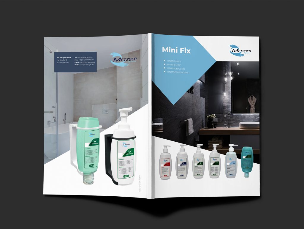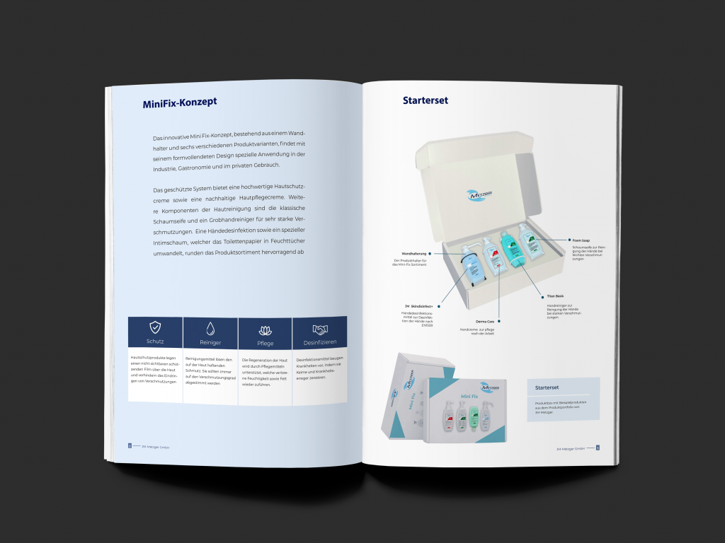The development of a professional and informative product brochure for the innovative Mini Fix concept (wall mount + 6 product variants). The employer’s key requirements were a modern, clean design, a clear structure with icons and explanatory texts, as well as complete print preparation according to the specifications of the printing company.