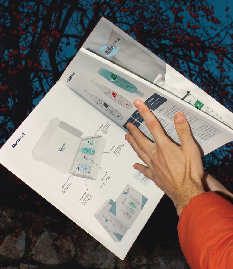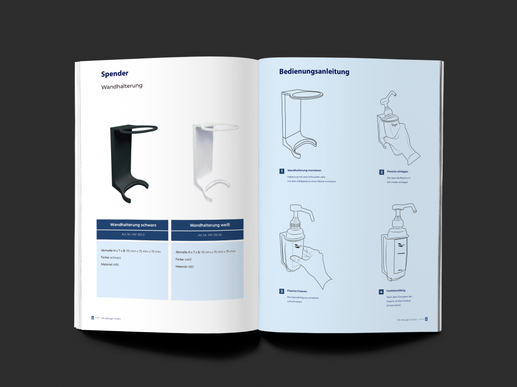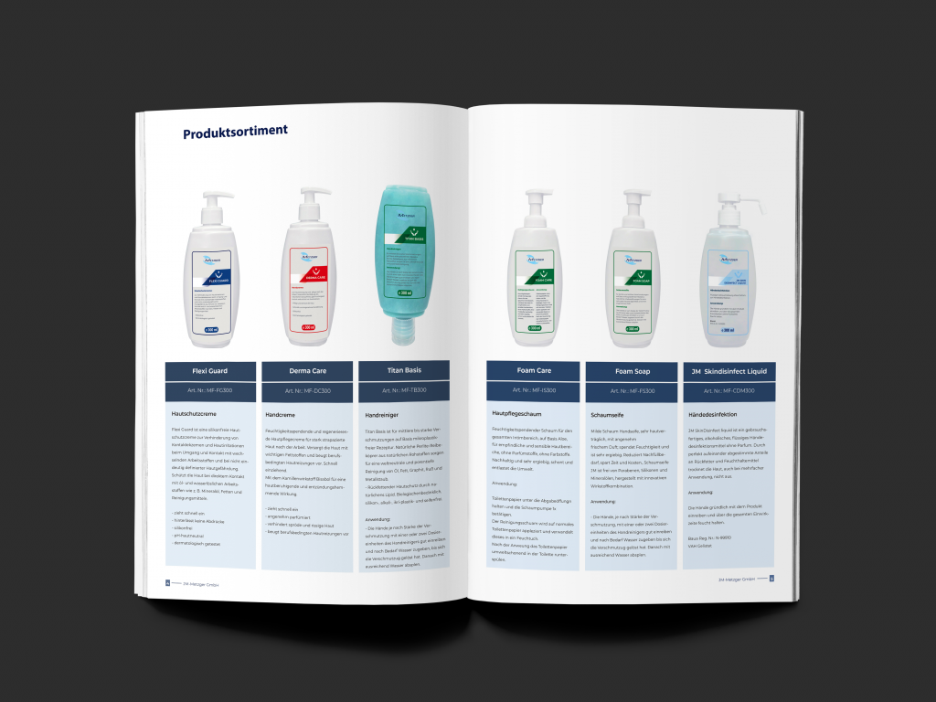 I designed an 8-page DIN A4 brochure (saddle-stitched, 250 g glossy cover, 135 g glossy inside pages). All product photos were taken and edited by me. In addition, I created the labels for the entire product line, designed icons for the categories Protection, Cleaning, Care, and Disinfection, and developed the user manual, which was integrated into the brochure. The layout was created in Adobe InDesign, image editing was done in Photoshop, and graphic elements were designed in Illustrator. The brochure was fully prepared for high-quality printing and conveys a professional, trustworthy appearance through its clear structure and modern design.
