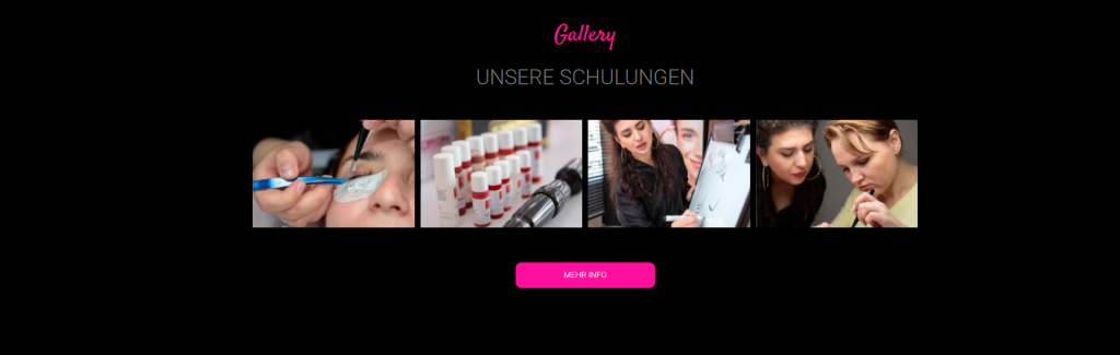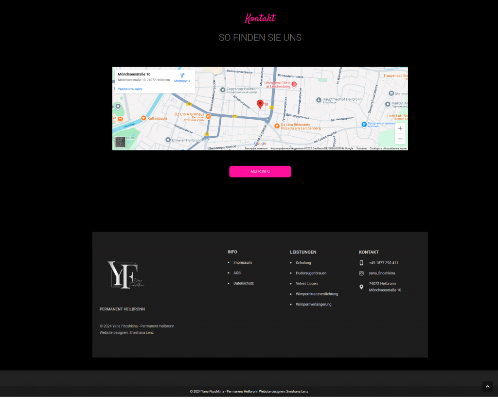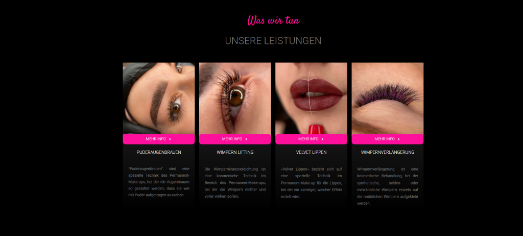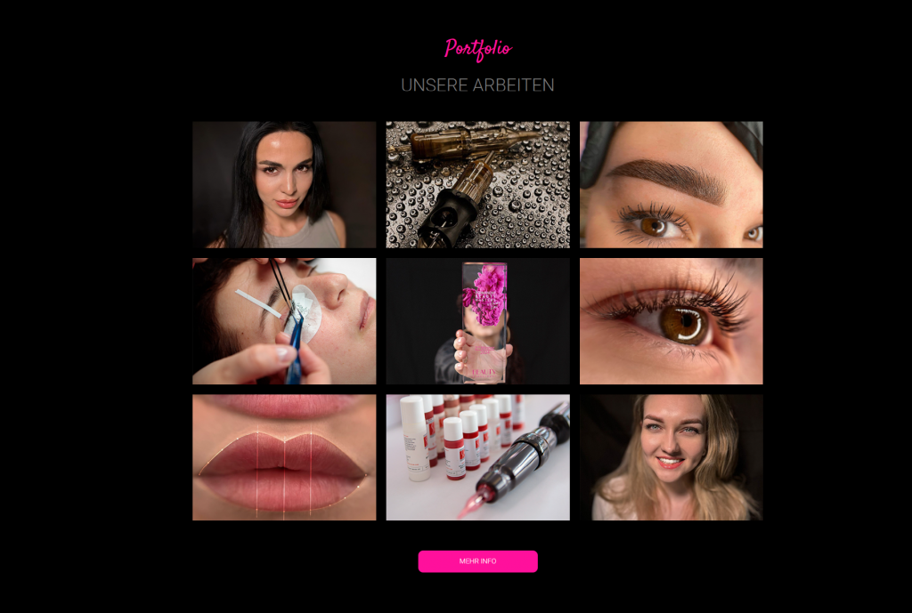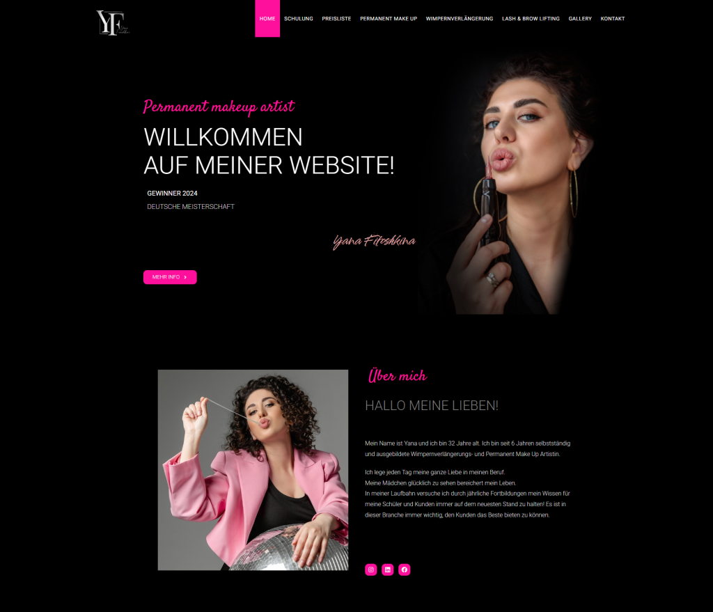 The client – the owner of a permanent make-up studio in Heilbronn – wanted a stylish website with a dark theme and a feminine accent color. She also needed an elegant logo, a training section with detailed pricing, and the ability to showcase photos and videos of her work.